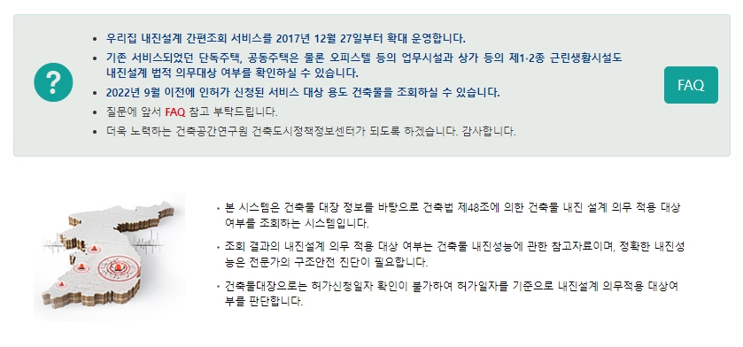 우리 집 내진설계 간편 조회서비스를 누르고 주소를 입력하면 내진설계가 되어있는지 확인을 할 수 있습니다.