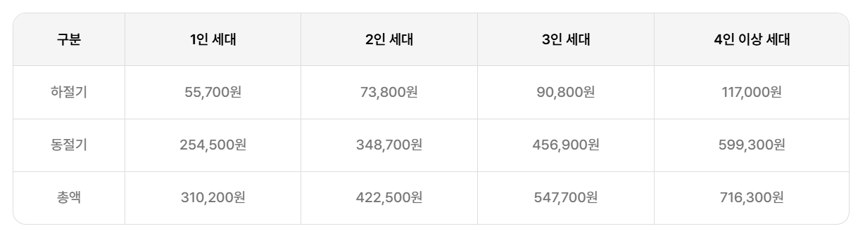 에너지바우처의 지원금액은 가구의 인원 수에 따라 다르게 책정됩니다. 2024년 기준으로 각 가구 유형별 지원금액은 다음과 같습니다.