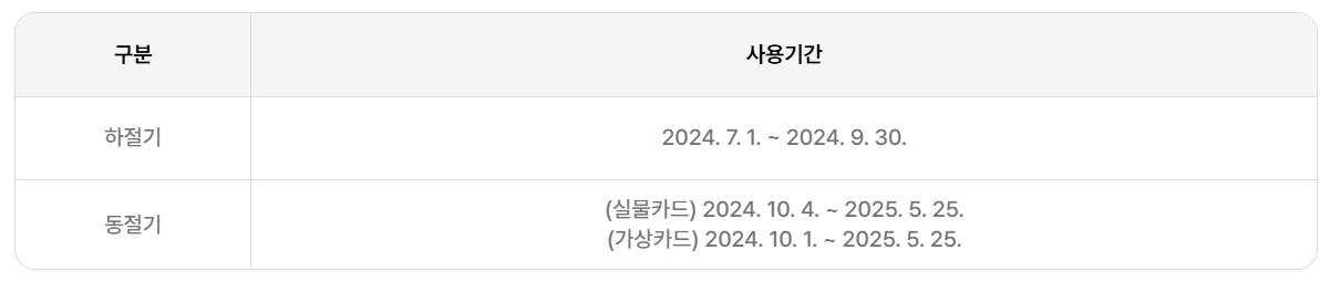 가상카드는 7월 1일부터 9월 말까지(하절기), 10월 1일부터 익년 5월 25일까지(동절기) 발행되는 발행 고지서에서 요금 차감 실시합니다.