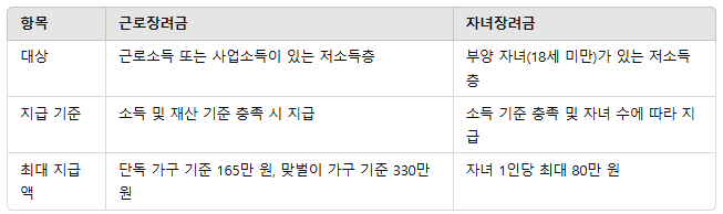 근로장려금과 자녀장려금의 차이
